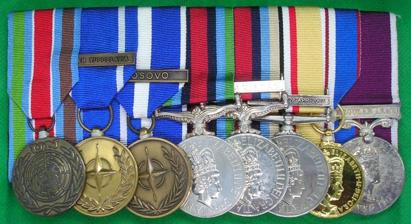 UN medal with Bosnia ribbon, Nato medal with Former Yugoslavia clasp, Nato medal with Kosovo clasp, Operational Service medal with Sierra Leone ribbon, Operational Service Medal with Afghanistan clasp, Iraq / Op-Telic medal with 19 Mar to 28 Apr 2003 clasp, 2002 Golden jubilee medal & EIIR 2nd type Regular Army LS&GC