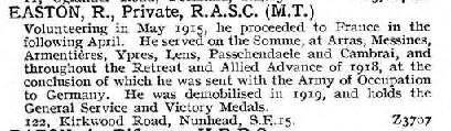 Raymond Easton lived at 26 Kendall Terrace, Leeds. He enlisted in January 1915 & first landed in France 26-7-1915 & went on to be awarded the MM for displaying coolness under fire in France in the London gazette 18-7-1917 & went on to be discharged to the class Z army reserve 26-8-1919. He has a good entry in the national roll of the great war (section 8, Leeds) which confirms most of the above details.
