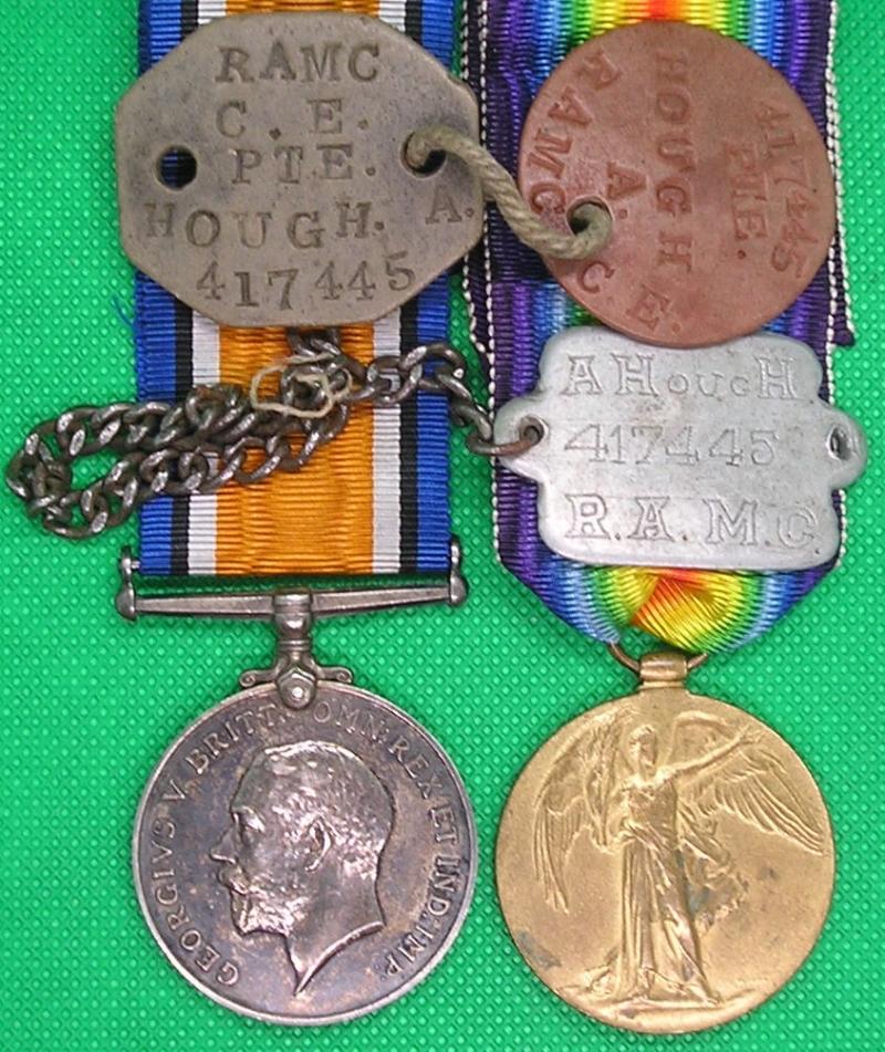 WW1 Pair with the recipients original theatre made aluminum wrist bracelet and pair of red & green fibre dog tags To- 2699.PTE.A.HOUGH.R.A.M.C Complete with MIC details