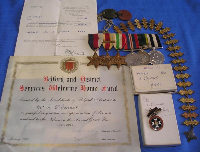 Eric O'Connor was a resident of Tweedmouth, Berwick on Tweed & originally enlisted in to the Royal Northumberland Fusiliers. He transferred to the Kings Royal Rifle Corps & became entitled to the efficiency medal whilst serving with that regiment. He applied for the issue of his campaign medals in 1948 whilst living at 3 Brewery Bank, Tweedmouth, Berwick on Tweed, Northumberland. He was a railway man by trade & a long serving member of the St. John ambulance brigade.